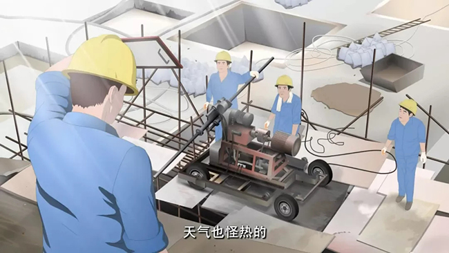 工長:“大家干了好一陣兒了,天氣也怪熱的!休息一下,喝口水吧!”