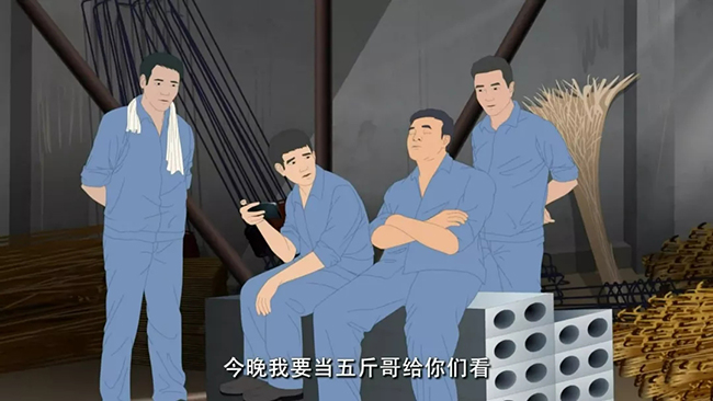 工友們坐在遮陽棚下。一個工友在觀看手機(jī)上的新聞視頻,叫道:“大壯,你快來看!”