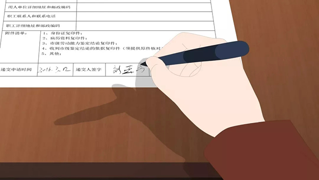 在勞動(dòng)能力鑒定委員會(huì)辦公室里,建筑公司人力資源部劉主任正在填寫(xiě)有關(guān)小強(qiáng)復(fù)查鑒定的申請(qǐng)表。